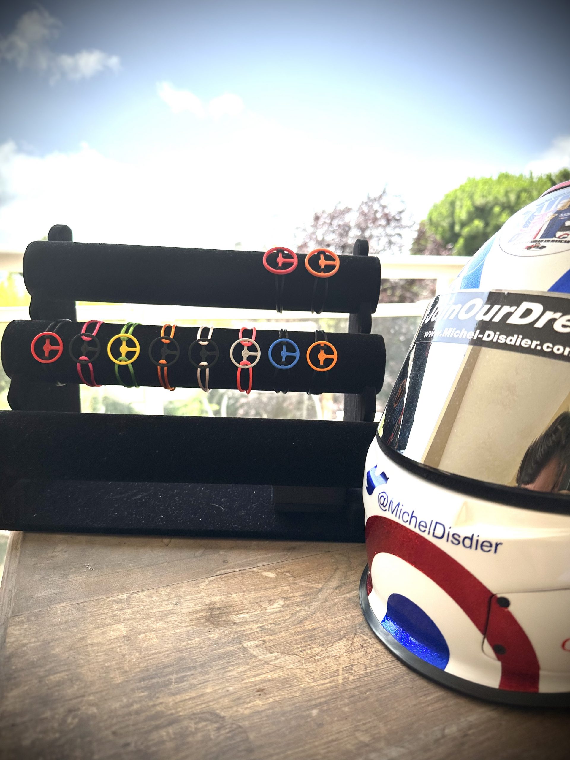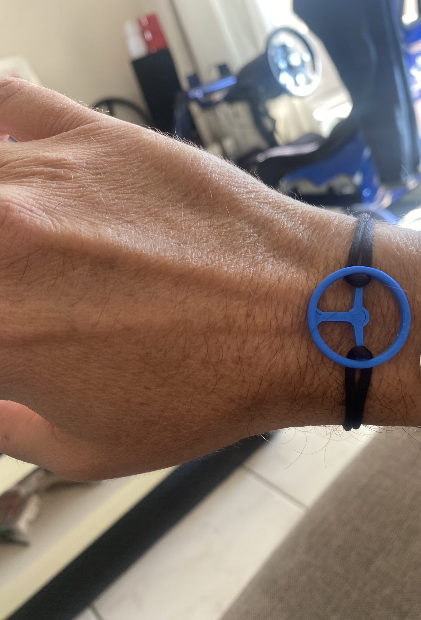 Bracelet Michel Disdier volant Nascar – le volant est réalisé en plastique recyclé et le bracelet est en corde "queue de rat"